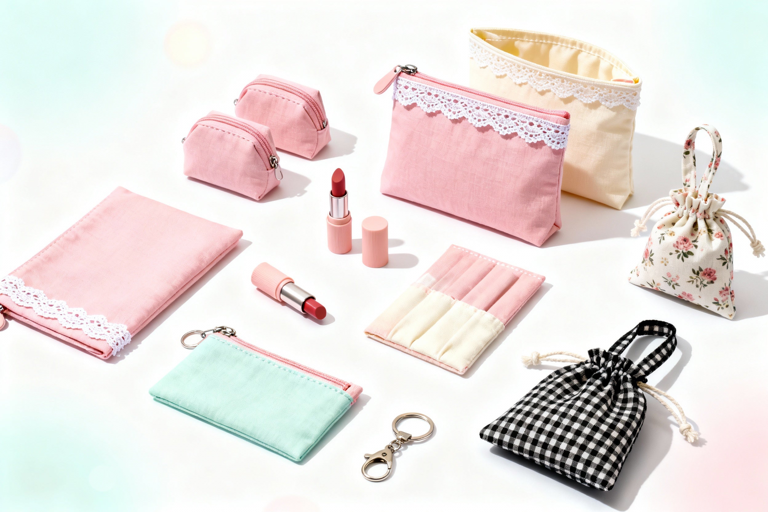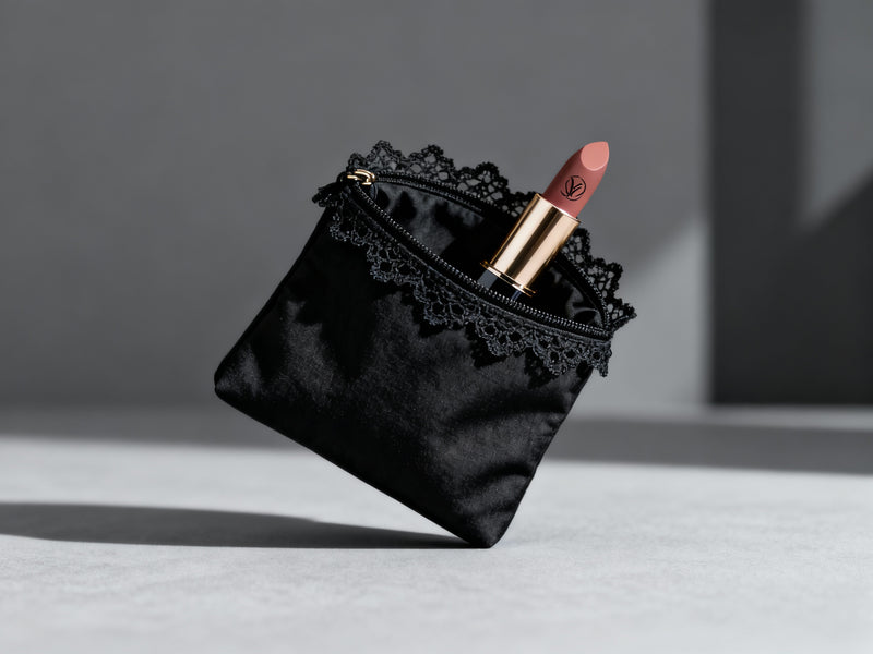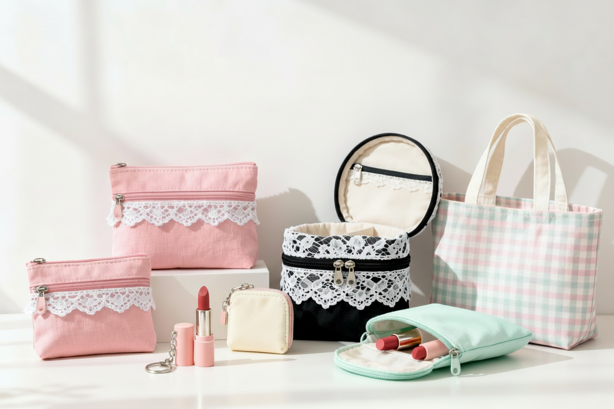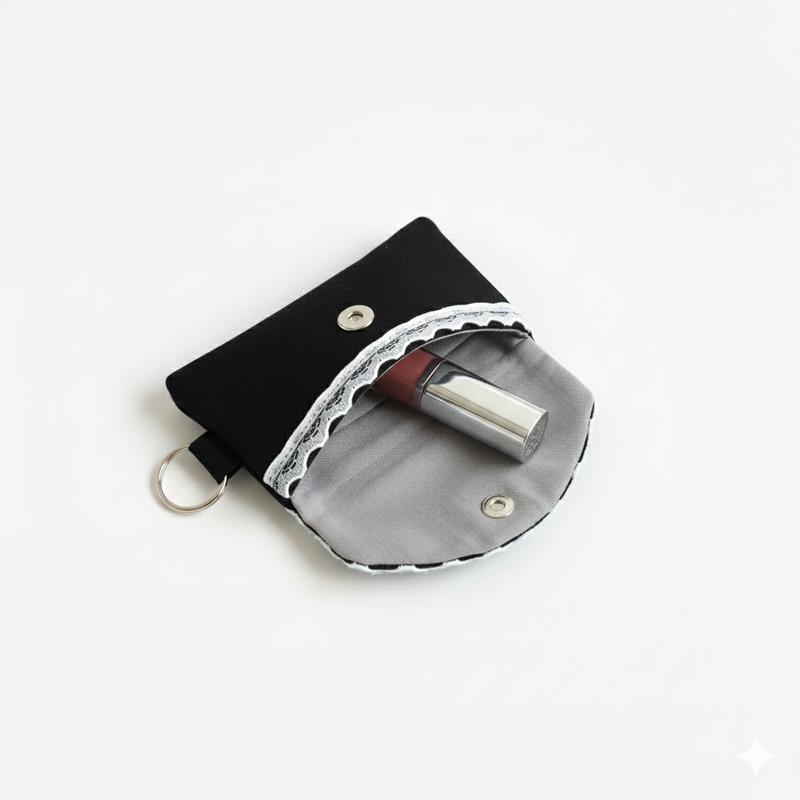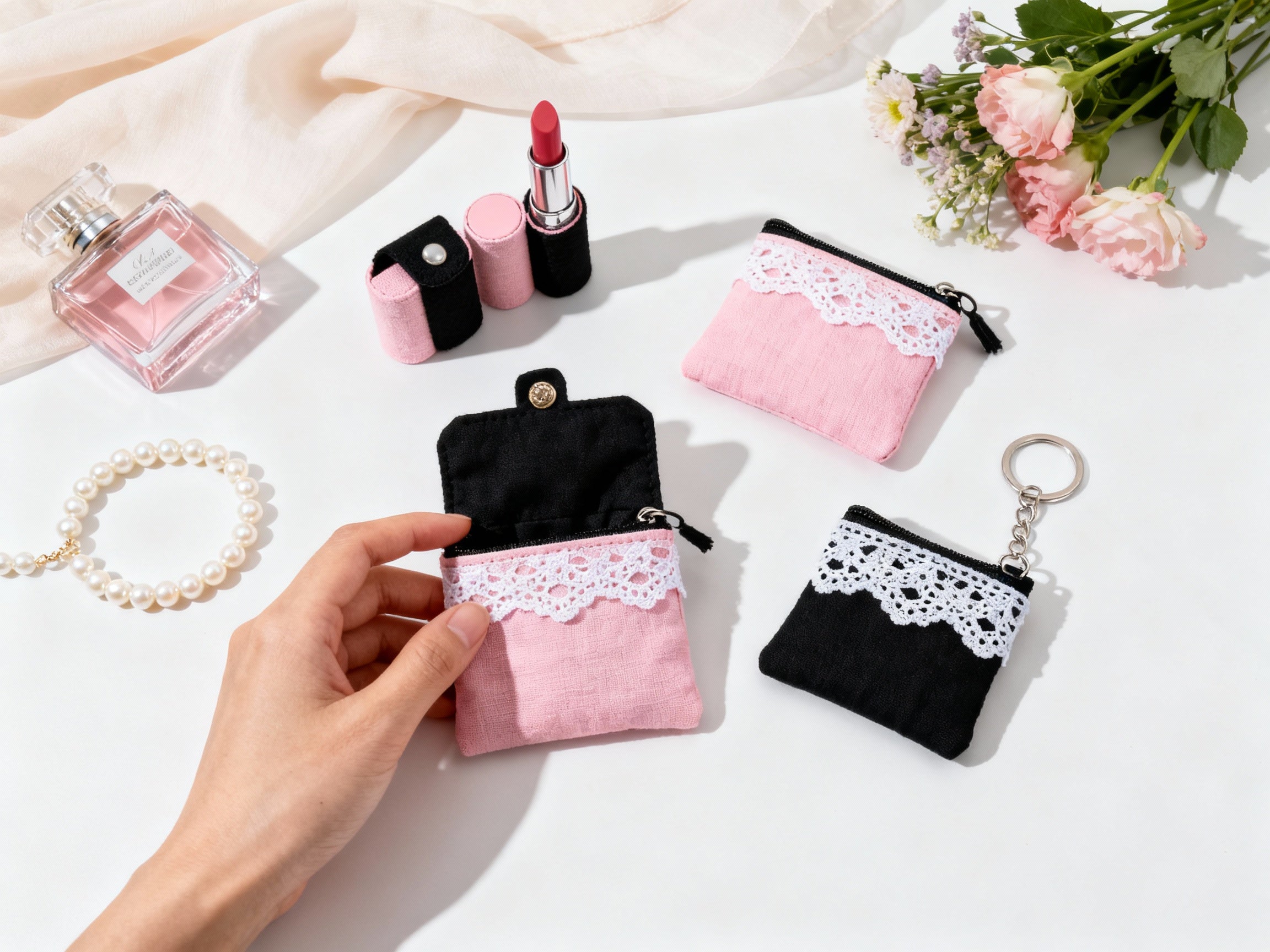 Pastel Lace Bow Cosmetic Pouch – Handmade Black Makeup Bag with Ivory Ribbon, Pearl Charm and Spacious Zip Closure for Everyday Beauty Essentials and Travel Storage